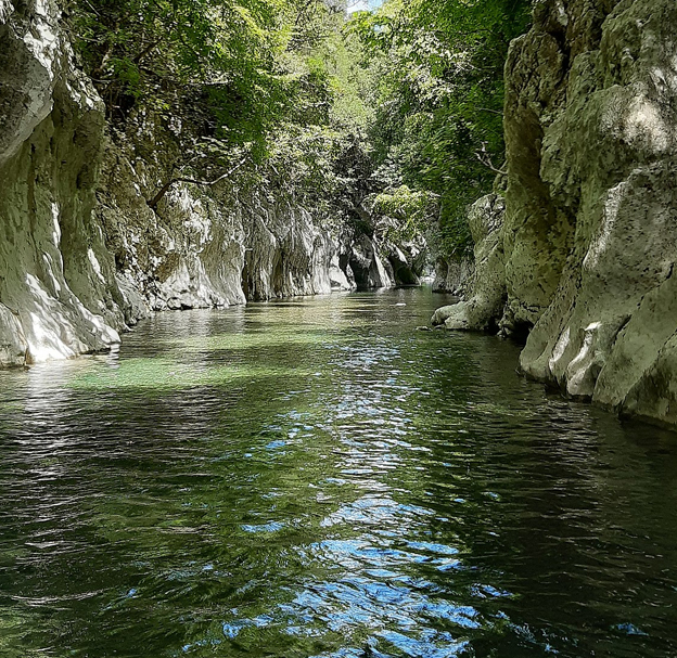 giù nelle acque limpide delle Gole del Calore e dei suoi canyon, fino alla spettacolare costa,